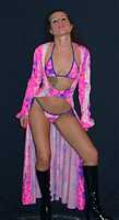 This beautiful wrap coat has yards and yards of gorgeous material that criss-crosses the front and button on the back of the garmet. Comes with a string bikini. What a knock-out outfit. Evrey dancer should have this in her wardrobe, it is a money maker. Scroll down for additional picures of this item. Color shown in picture above is sold out!!